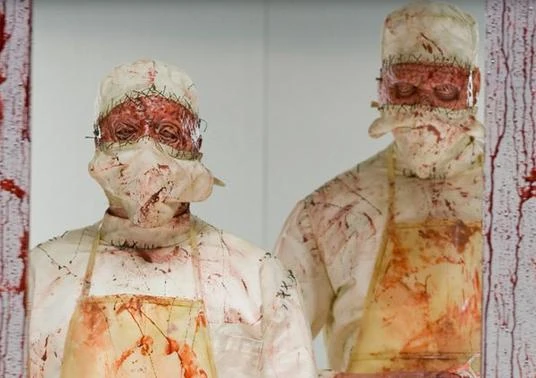 The Doctors are a pair of (possibly) human men dressed in white surgical suits. They wear yellow aprons, and have white face masks and matching caps. However, if one looks closely, both the masks and the caps are stitched into the skin of the doctor's faces and heads, fixed permanently in place. They are also splattered with blood and carry medical kits filled with crude tools they use to perform horrid medical experiments and 'treatments' on their victims, their modus operandi for killing. The skin of both Doctors appears to be severely burnt, scarring the entirety of their faces and possibly the rest of their bodies. Whether this appearance was due to some past injury or simply their inherent biology as a creation of the Ancient Ones is unknown. One of the Doctors is shorter than the other, and its eyes appear to have melted off or otherwise been damaged, while the other, taller Doctor appears to be in slightly better condition, with intact eyes. The Doctors are shown to have sadistic personalities, performing their heinous acts of medical torture on any humans they can capture. The surgeries they perform always cause their victim death or severe pain and may be completely experimental or outdated in practice.